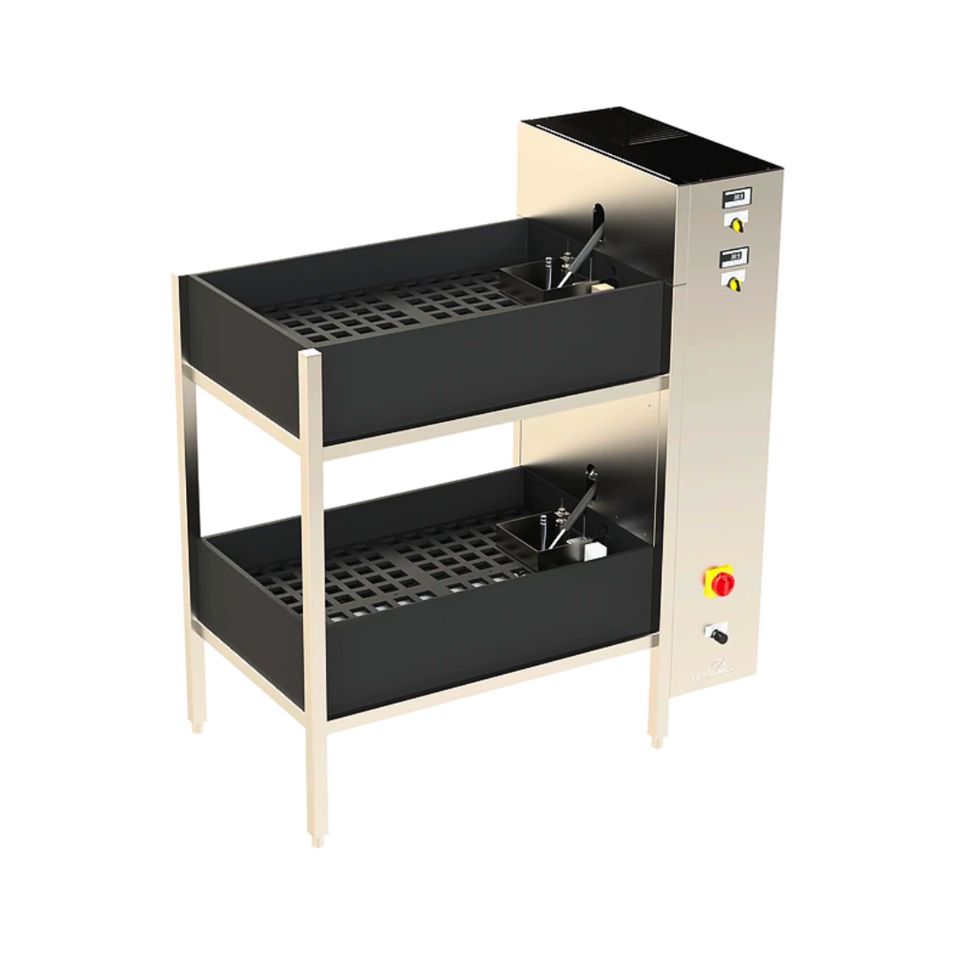 Baños de agua para almacenar muestras prismáticas de mortero para aplicaciones de ensayo de cemento y mortero, que constan de una estructura de acero inoxidable con 2 depósitos de plástico.
