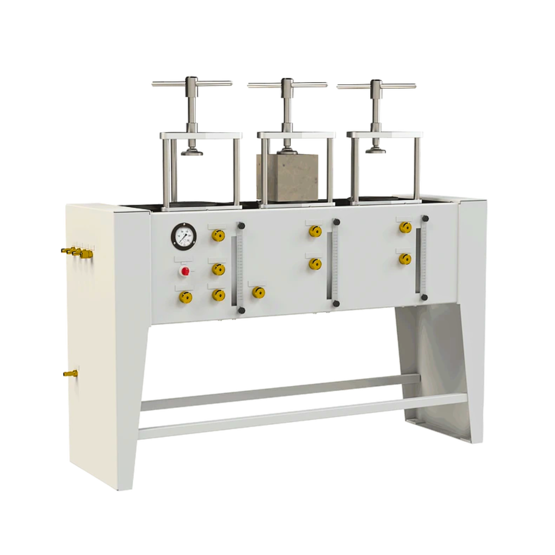 Se utiliza para determinar la impermeabilidad superficial del hormigón al agua mediante probetas. El dispositivo determina la profundidad de penetración del agua en el hormigón endurecido bajo un tiempo y presión determinados. Las probetas se colocan en la cámara de ensayo, se sujetan con bridas y juntas adecuadas, y se aplica una presión de agua conocida a la superficie de la probeta durante el tiempo especificado en la norma. Se utiliza un compresor de aire para proporcionar una presión adecuada y constante. La penetración del agua se mide cuantitativamente mediante buretas graduadas.